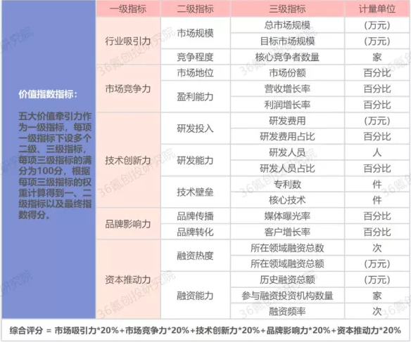 36 氪創(chuàng)投研究院動態(tài)跟蹤觀察了新經(jīng)濟(jì)市場獨(dú)角獸企業(yè)們,根據(jù)學(xué)術(shù)界和一級市場參與者們對獨(dú)角獸企業(yè)的成長機(jī)制及估值研究,結(jié)合問卷調(diào)研、桌面研究、數(shù)據(jù)整理等方式,回溯了每一家獨(dú)角獸企業(yè)自其成立以來的表現(xiàn),并建立【價值指數(shù)模型】為獨(dú)角獸們評分。